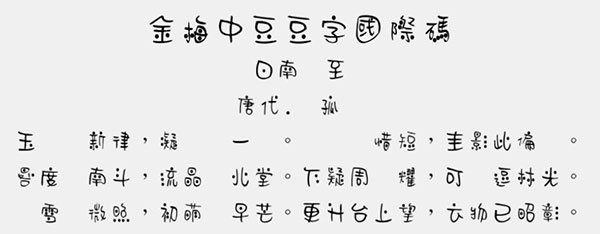 金梅中豆豆字国际码字体是一款个性醒目的艺术字体,该字体书写独特,字体中部分设计采用了原点的设计,使得字里行间更加可爱,并且具有强烈的视觉冲击力,整体上效果比较突出,给人非常震撼的感觉,可以很好的应用于文本装潢、信息展示、网页设计、篆刻制模、数据制作、装潢设计、计算艺术设计、视觉设计、字帖等一切合法应用场景,有喜欢的朋友可免费下载收藏。