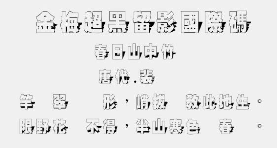 金梅超黑留影国际码字体是一款非常独特的艺术字体,该字体个性醒目,空心设计并带有局部阴影,具有强烈的视觉冲击力,整体上效果比较突出,给人非常震撼的感觉,可以很好的应用于文本装潢、信息展示、网页设计、篆刻制模、数据制作、装潢设计、计算艺术设计、视觉设计、字帖等一切合法应用场景,有喜欢的朋友可免费下载收藏。