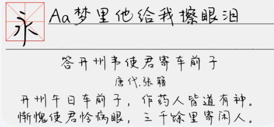 本站Aa梦里他给我擦眼泪字体资源仅供个人学习与参考,如需商业使用请到相关官网授权。