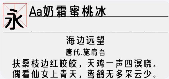 Aa奶霜蜜桃冰字体是一款非常大方秀丽的艺术字体,该字体的字面是属于开阔的,其字型也是带有稚气,收放有度,完全不矫情,受到大批小年轻的喜爱,并具有超强的视觉感,可以很好的应用于文本装潢、信息展示、网页设计、篆刻制模、数据制作、装潢设计、计算艺术设计、视觉设计、字帖等一切合法应用场景,有喜欢的小伙伴可以免费下载收藏。