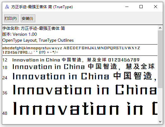 方正手迹最强王者体简是方正字库推出的一款个性鲜明,易于阅读的字体,该字体每个字棱角分明,锋芒毕露,霸气、舍我其谁的王者风范,是它的精神内核。除了霸气的笔画设计,字形设计上有较好的阅读性,可以应用于文本装潢、信息展示、网页设计、篆刻制模、数据制作、装潢设计、计算艺术设计、视觉设计、字帖等一切合法应用场景,有喜欢的朋友可免费下载收藏。