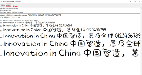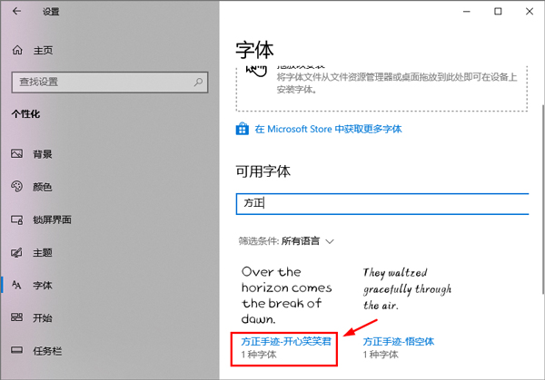 3、安装完成后,打开控制面板,搜索字体设置,然后搜索方正手迹-开心笑笑君即可使用。