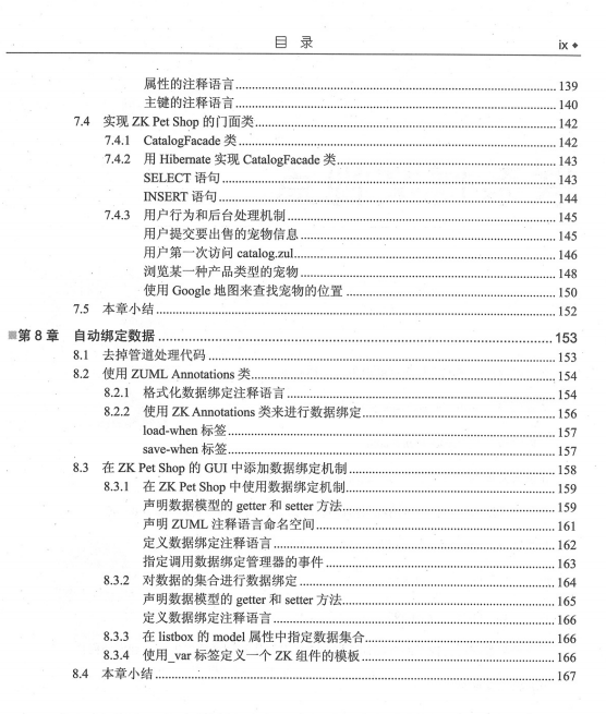 关于作者 关于技术评审 介绍 第一部分 了解ZK Ajax框架 第1章 什么是ZK Ajax框架 1.1 ZK Ajax框架 1.1.1 Ajax:后台处理技术 1.1.2 表现层 1.1.3 以服务端为中心的事件驱动框架 1.1.4 基于组件的GUI工具箱 1.2 本章小结 第2章 开始ZK之旅 2.1 安装Java运行时环境 2.2 安装Java servlet容器 2.2.1 使用Installer包 2.2.2 使用ZIP文件 2.3 部署和测试zkdemo-all.war 2.4 相关的类库 2.5 配置web.xml 2.6 配置zk.xml 2.7 本章小结 第3章 构建你的第一个ZK应用 3.1 第一个ZK应用:Hello World 3.2 第一个ZK组件:窗体(Window)组件 3.3 将Ajax注入到你的ZK应用中 3.4 本章小结 第4章 介绍通用ZK组件 4.1 组件,页面和桌面 4.2 组件的生命周期 4.2.1 ZUML页面的生命周期 页面初始化阶段 组件创建阶段 事件处理阶段 回填阶段 4.2.2 更新页面 请求处理阶段 事件处理阶段 回填阶段 4.3 组件垃圾回收 4.4 使用组件的属性 4.4.1 组件的id属性 4.4.2 组件的if和unless属性 4.4.3 组件的forEach属性 4.4.4 组件的use属性 4.4.5 1D空间(ID Spaces) 获取ID空间范围内的成员组件 获取ID空间范围外的组件 4.4.6 获取另一个页面中的组件 4.4.7 使用zscript和EL表达式 zscrlpt EL表达式 4.5 事件 4.6 ZUML和XML命名空间 4.7 创建真实的模式对话框(modal dialog) 4.7.1 消息框 4.7.2 文件上传 4.8 实现宏组件(Macro Component) 4.8.1 集成大组件(Mega Component) Google地图 FCKeditor Dojo 4.9 本章小结 第二部分 应用ZK框架 第5章 搭建开发环境 5.1 安装Java SE(JDK) 5.2 安装Tomcat 5.3 安装Eclipse IDE SDK 5.3.1 安装带WTP插件的Eclipse 5.3.2 指定Eclipse的工作空间 5.3.3 设置Tomcat和Elicpse一同工作 5.3.4 定义一个服务器实例(Serverlnstance) 5.4 在XML编辑器中设置。zul文件扩展名的关联 5.5 配置ZK和Eclipse一同工作 5.5.1 创建一个动态Web工程 5.5.2 导入ZKJAR类库并设置Web配置 5.5.3 创建一个新的index.zul文件 5.5.4 运行你的第一个应用程序 5.6 更多方便的工具 5.6.1 导入ZK源代码到Eclipse中 5.6.2 集成zul.xsd的XML Schema文件 5.6.3 使用zul.xsd这个XML Schema文件创建一个页面 5.6.4 在Eclipse中找回丢失的xsd文件URL 5.7 本章小结 第6章 创建一个真实的Web应用 6.1 介绍Java Pet Store 2.0 6.2 创建ZK Pet Shop应用 6.2.1 安装ZK Pet Shop 6.3 创建ZK Pet Shop的主页 6.3.1 使用Dojo构建Fish-Eye列表 6.3.2 监听onClick事件 6.3.3 构建带超链接功能的图片 6.3.4 将banner.zul包含到index.zul中 添加鹦鹉图标 添加标题 添加菜单条 6.4 ZK Pet Shop应用的需求 6.4.1 视图和控制器之间的互操作 6.5 发布宠物信息 6.5.1 创建seller.zul 声明seller.zul的控制器 创建一个用来提交宠物信息的表单 添加富文本编辑器 提供文件上传功能 创建一个表单用来提交卖家的联系方式信息 添加一个CAPTCHA 添加客户端验证约束 保存用户提交的信息到数据库中 6.6 浏览宠物信息和照片 6.6.1 更新catalog.zul文件 创建菜单条 创建宠物的大图 创建宠物的缩略图长廊 创建描述面板 6.7 使用Google地图来搜索宠物的位置 6.7.1 创建mapall.zul 创建一个表单用于提交用户的地址作为查询条件 使用Google地图来显示宠物的位置 在Google地图中显示结果 在gmap组件上显示宠物的位置 在grid中显示宠物的信息 重定向页面到catalog.zul 在地图上提示宠物的位置 自定义事件监听器 在弹出窗口中显示宠物的详细信息及缩略图 创建popup.zul 6.8 本章小结 第7章 将GUI和数据库进行链接 7.1 准备数据库环境 7.1.1 下载HSQL数据库 7.1.2 创建ZK Pet Shop数据表 7.1.3 JDBC和连接池 7.2 让ZK和Hibernate一同工作 7.2.1 使用Hibernate的先决条件 创建Java类 编辑Hibernate配置文件 映射对象资源 7.2.3 使用映射文件的方式 7.2.4 使用Java注释(Annotations)语言 7.2.5 Hibernate的高级特征工作单元 保持一个会话为开启状态 配置ZK来使用会话 7.3 ZK Pet Shop中带注释语言的数据模型 表的注释语言 属性的注释语言 主键的注释语言 7.4 实现ZK Pet Shop的门面类 7.4.1 CatalogFacade类 7.4.2 用Hibernate实现CatalogFacade类 SELECT语句 INSERT语句 7.4.3 用户行为和后台处理机制 用户提交要出售的宠物信息 用户第一次访问catalog.zul 浏览某一种产品类型的宠物 使用Google地图来查找宠物的位置 7.5 本章小结 第8章 自动绑定数据 8.1 去掉管道处理代码 8.2 使用ZUML Annotations类 8.2.1 格式化数据绑定注释语言 8.2.2 使用ZK Annotations类来进行数据绑定 load-when标签 save-when标签 8.3 在ZK Pet Shop的GUl中添加数据绑定机制 8.3.1 在ZK Pet Shop中使用数据绑定机制 声明数据模型的getter和setter方法 声明ZUML注释语言命名空间 定义数据绑定注释语言 指定调用数据绑定管理器的事件 8.3.2 对数据的集合进行数据绑定 声明数据模型的getter和setter方法 定义数据绑定注释语言 8.3.3 在listbox的model属性中指定数据集合 8.3.4 使用_var标签定义一个ZK组件的模板 8.4 本章小结