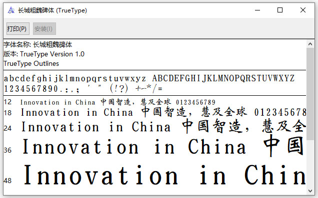 长城粗魏碑体是一款适合美工设计的字体,线条均匀,字形端庄,整体效果统一,字库也很完整,可以用于论文、广告、PPT、电影片头等多种场景。安装方法挺简单的,Win系统有直接右键安装的方法,还有通过控制面板复制粘贴安装的备选方案;Mac系统则支持双击安装或拖拽到字体库等操作。