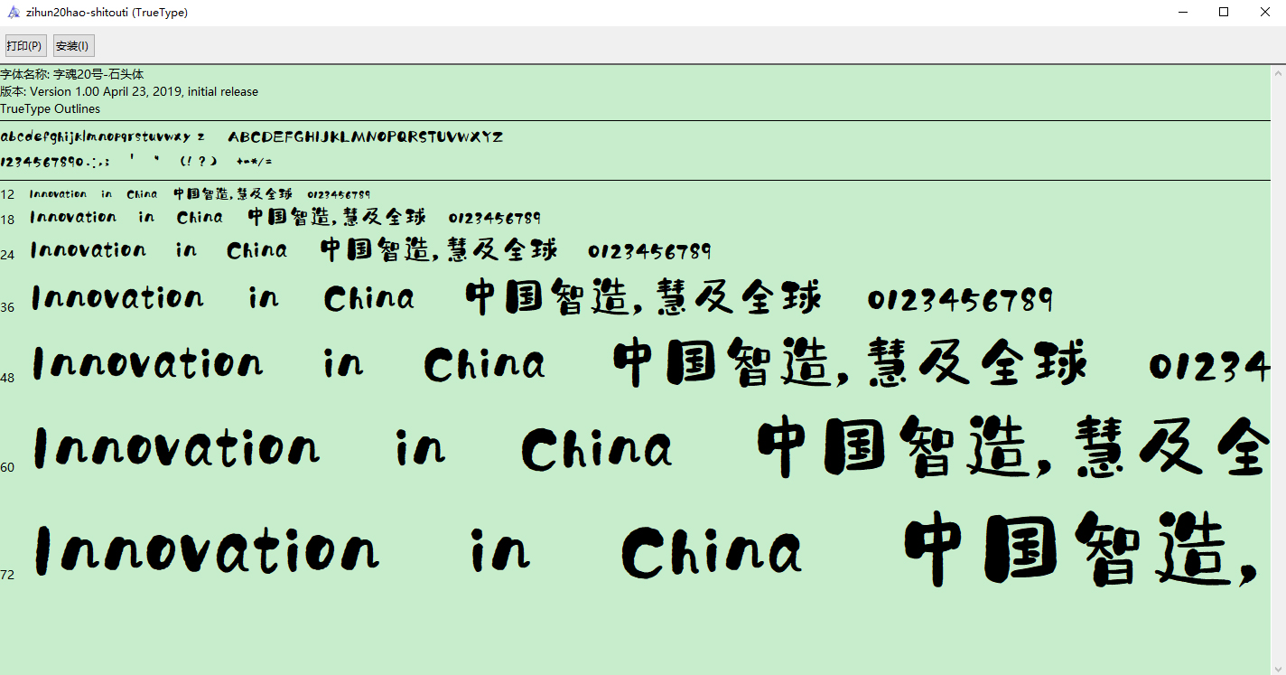 字魂20号石头体是一款风格相当独特的手写字体,该字体厚重,有力量感,其整体效果出色,即可以适用于节日促销、教育培训、食品饮料、家居生活,及其相关的儿童母婴场景,也能够应用于文本装潢、信息展示、网页设计、篆刻制模、数据制作、装潢设计、计算艺术设计、视觉设计、字帖等一切合法应用场景,有喜欢的朋友可免费下载收藏。