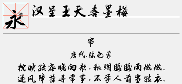 汉呈王天喜墨梅字体是由汉呈字库推出的一款古典中国风字体,其字体的整体视觉效果看上去非常的简约,同时还加入了一些小图案来装饰,具有很好的视觉感,且字库完整,可以很好的应用于文本装潢、信息展示、网页设计、篆刻制模、数据制作、装潢设计、计算艺术设计、视觉设计、字帖等一切合法应用场景,有喜欢的朋友可免费下载收藏。