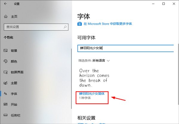 3、安装完成后,打开控制面板,搜索字体设置,然后搜索蝉羽阳光少女简体字体即可使用。