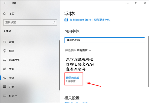 3、安装完成后,打开控制面板,搜索字体设置,然后搜索蝉羽芭比熊字体即可使用。