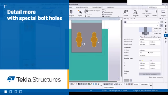 现在,您可以找到 许多项目和材料类型的特殊类型的 螺栓和孔 的多项改进 。在开槽孔中偏移螺栓的可能性可帮助您对 PEB 结构、门架、锅炉等进行建模 。现在,当由于扳手工具空间不足或无法进入接头的另一侧而无法安装螺母时,可以为接头建模螺纹孔。您还可以对同一螺栓组中的各种特殊孔进行建模。