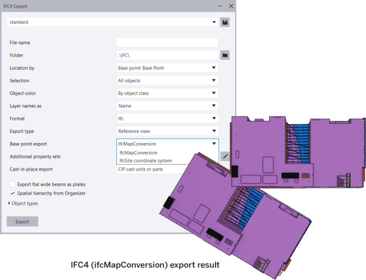协作是 BIM 成功的关键。现在,您可以选择如何利用 base 点进行 IFC4 导出,以帮助将 BIM 模型位置与土木坐标系对齐。这在有很多项目合作方使用不同软件的项目中特别有用。