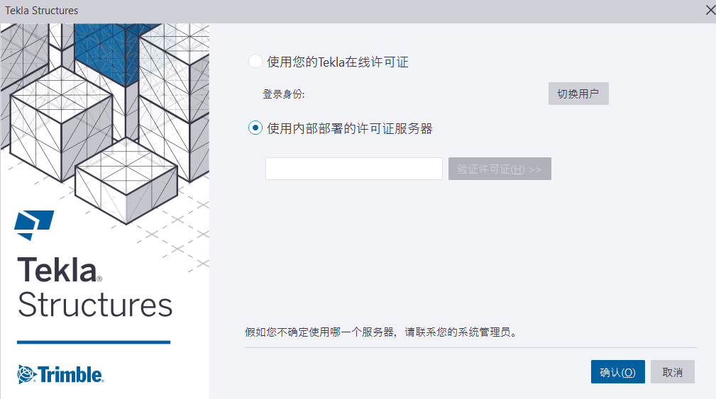 内部部署的许可证是通过本地许可证服务器去管理激活的,若您的许可证激活在自己电脑上的话,则在验证许可证这里不用填写任何信息,若是许可证激活在服务器上,则这一行中需要填写27007@(服务器IP地址/电脑名称),详见Tekla学习第二课—Tekla Structures FlexNET许可服务器安装。