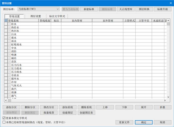 管线设置中提供强大的自定义管线系统功能,可根据设计要求自定义管线名称、线宽、线性、管材等信息,并可将自定义信息应用于绘制管线、绘制立管、系统生成等功能中。并且软件采用三维管道设计,自动生成管道节点,模糊的操作实现管线与设备、阀门的精确连接,自动完成遮挡处理,并保持单个管线的整体性;当交叉管线之间、管线与设备、文字的位置发生变化时,系统会自动更新遮挡处理。管线标注信息与图形统一,保证计算和统计的正确性。