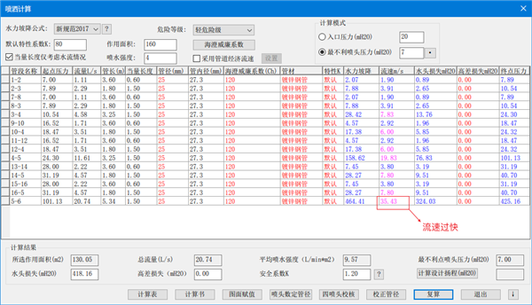 喷淋计算按建筑物的危险等级框选作用面积可计算系统入口压力,或提供入口压力反算最不利点喷头压力,最后完成WORD计算书。计算后自动判断各管段流速情况,以便设计师可以调整管径进行实时复算。