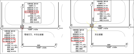 交叉检查:软件可以检测室外管道之间的碰撞。不单单是真实的管道碰撞软件可以检测出来,即便是管外皮小于规定间距的管道,软件也可以将其碰撞的位置检测出来。软件会自动根据标高和管径信息搜索出管线交叉或碰撞的位置。管道交叉处红叉表示,管道在空间位置上交叉,但未发生碰撞,可通过对象查询井底标高判断管道的具体位置;管道交叉处黄叉表示,管道在空间位置上发生碰撞,可通过对象查询井底标高并可修改,重新埋深计算后,达到规定距离要求。