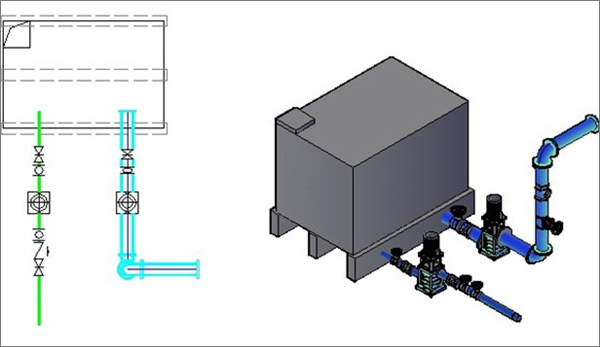 可进行水泵选型、水泵水箱间平面图的绘制,依靠剖面生成命令自动生成剖面图。除此之外,还可以进行双线水管的绘制,在双线水管的立管上可以直接插入阀门,这是其他软件所不能比拟的。水泵房也可以进行整体三维的观察。