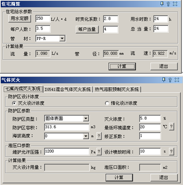 (13)气体灭火计算:可通过七氟丙烷、IG541、热气溶胶计算灭火(惰化)设计用量和泄压口面积。