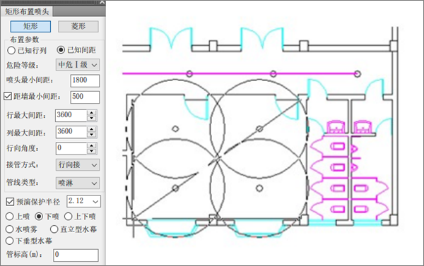 提供多种布置喷淋设备的方案,包括“任意布置”、“直线喷头”、“矩形喷头”、“等距喷头”,“扇形喷头”、“弧线喷头”相互可配合使用。