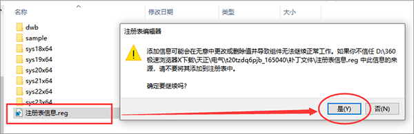 5、接下来进行打开补丁文件,双击“注册表信息.reg”添加注册表;