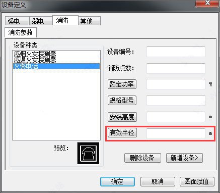 【设备定义】对于消防、安防、广播、应急灯具设备图块,增加有效半径参数,并可通过【显示半径】和【隐藏半径】命令控制显示或隐藏。