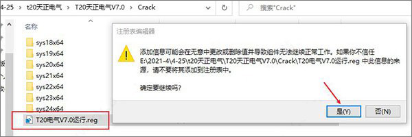8、然后再运行Crack文件夹中的T20电气V7.0运行.reg注册表,以此点击是-确定;