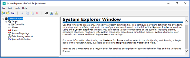 (2)系统浏览器:用于修改系统定义文件。可通过双击系统定义文件(.nivssdf),从项目文件(Project Files)窗格的VeriStand编辑器访问此窗口。