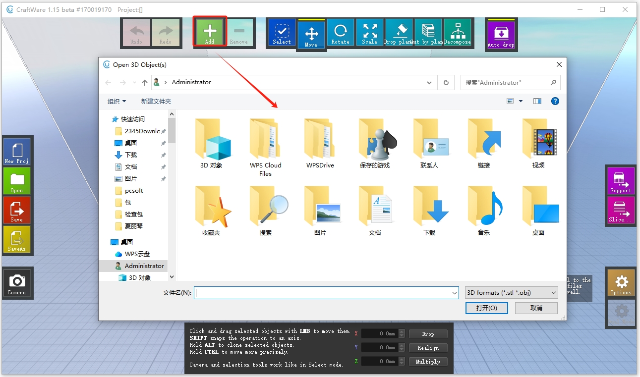 3、从ADD上找到需要转换切割路径的3D模型作品,这里添加3D formats(.stl *.obj)模型文件。