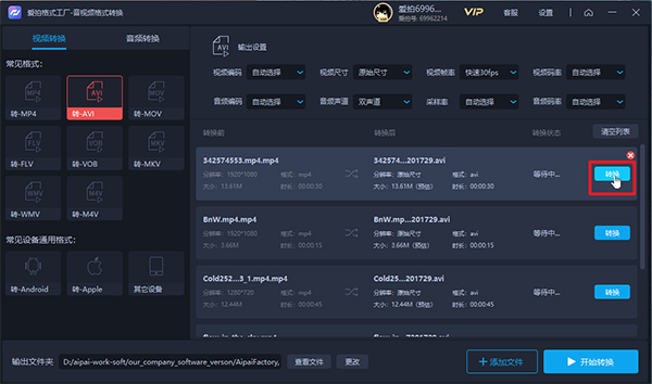 6、在列表中,点击【转换】,可对音视频文件进行单个转换;