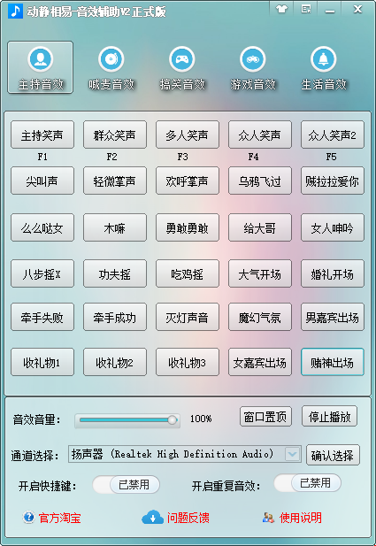 动静相易音效辅助电脑版是一款便捷实用的音频音效辅助工具。这款工具分为主持音效、喊麦音效、搞笑音效、游戏音效及生活音效,可以快速播放出你想要的音效、搞笑搞怪、小孩、各种明星的音效,对于需要音效配音或其它作用的用户来说是非常方便的,并且它的操作方法也是非常的简单,如果你不会用的话,在动静相易音效辅助中还有视频教程,你可以参照下,有喜欢的动静相易音效辅助工具的朋友欢迎前来下载使用!