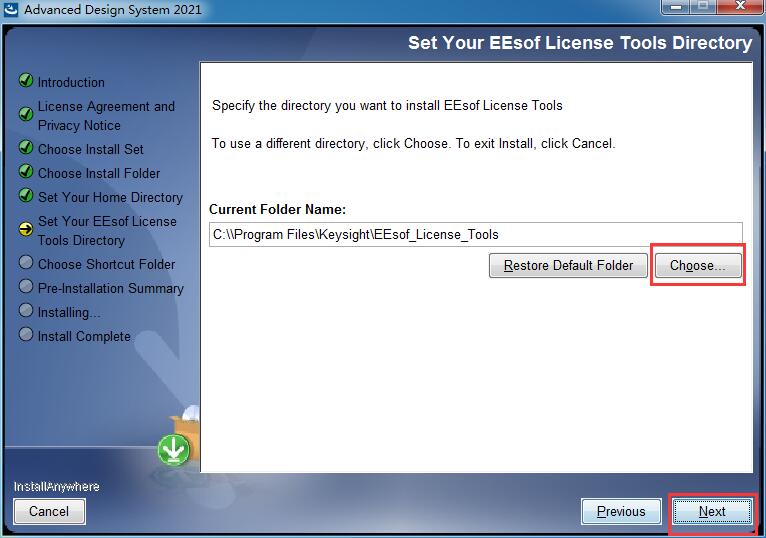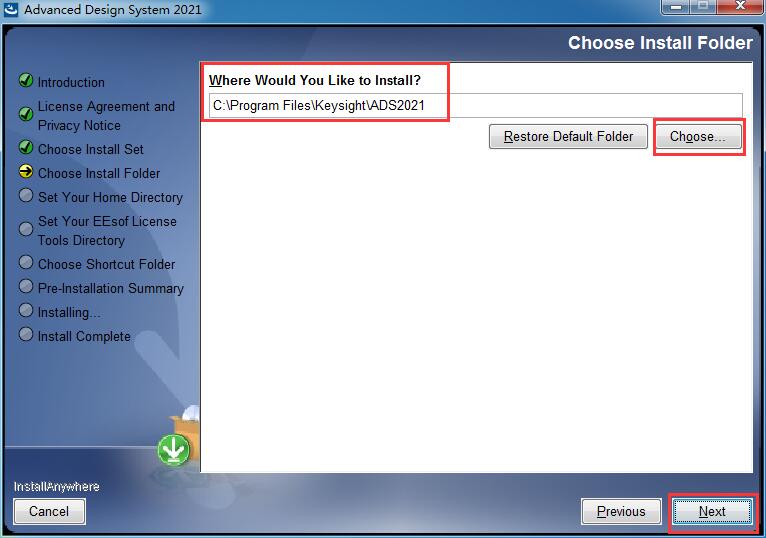 6、选择安装位置,默认的是【C:\Program Files\Keysight\ADS2021】,可以单击【choose】按钮修改