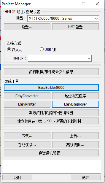 3、双击打开软件,需要先设置HMI IP地址及密码,选择连接方式和编辑工具,选择完毕后将自动跳转软件主页。
