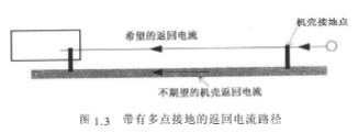 使用单一的机壳接地的目的是为了防止在机壳中出现循环的电流D。如果使用多个接地点,即电流在返回时有另外一个途径,则电流的一部分将流经机壳(如图 1.3 中 所示 这部分电流的大小将取决于与对频率非常敏感的阻抗比。这样,这些流经机壳的电流大小将很难被掌握,并且它会随着电路结构的不同而不同,因此,这些电流会造成一些意想不到的.令人厌烦的影响:在对一个振荡和干扰进行全力跟踪了若干小时之后,才发现当将一颗看上去无关紧要螺丝钉再拧紧到机壳上时,问题竟然解决了。这些机壳上的连接点都会受到腐蚀的影响,因此单元电路的性能会随时间而下降,并且它们还将受到机壳材料表面氧化的影响。如果在设计中使用了多点机壳接地,那么,对机壳的电气结构就需要格外注意。