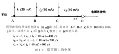也许,在电子电路中最可能造成众多问题的原因,就是将零线和地线进行了混用。之所以这样讲,是因为在一个正常的工作电路中,它只可能有一个点是真正的零电压:注意,在实际应用中的“零线”与理论定义中的概念,是相互矛盾的。这是因为,任何一个实际的导体都会有一个有限的、非零的电阻或阻抗,欧姆定律告诉我们,当电流通过任何一个阻抗不为零的物体时,都会在其上产生一定的电压。在一个正常工作的电路中,必然会有一定的电流流过那些被定义为零电压的导线,因此,如果在这条导线上,只有一点可以是真正的零电乐(一般认为,这一点就是在电源输出的连接点上),那么这条线上剩余的其他部分将不可能再是零电压,如图 1.1所示。