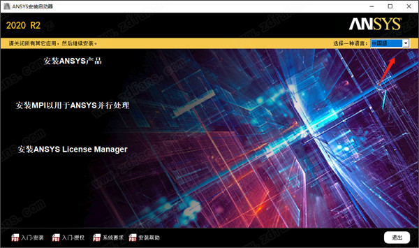 2、用虚拟光驱加载iso文件或用winrar直接进行解压,双击setup.exe运行安装,在右上角语言选择中文,然后点击安装ANSYS产品;