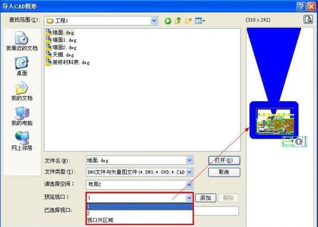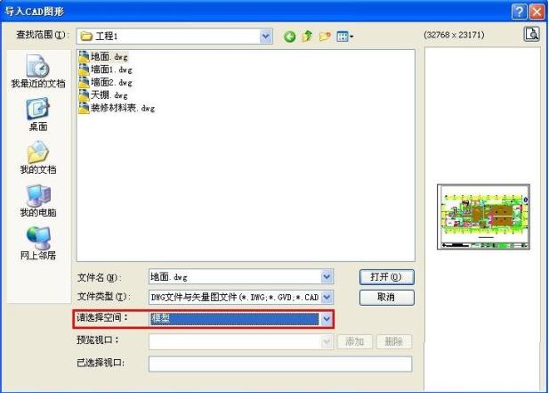 在弹出的窗口中选择空间,可以选择CAD图的模型或布局,如【选择空间】选择了CAD布局,还可进一步在【预览视口】中选择视口,并添加到【已选择视口】;