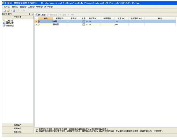 点击“新建向导”,在弹出的窗体依次输入“工程名称”、“工程信息”、“编制信息”,点击“完成”即可完成一个工程的新建,建立完成后如下图所示: