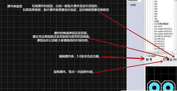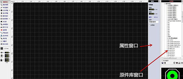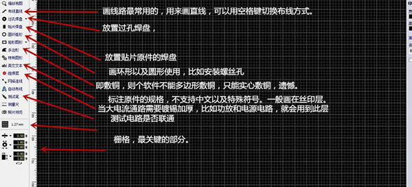 5、左侧为常用工具栏,就包括编辑、缩放、部件、焊盘、SMD焊盘、圆弧、覆铜、特殊形状、文字、连接线、测试笔、栅格等等
