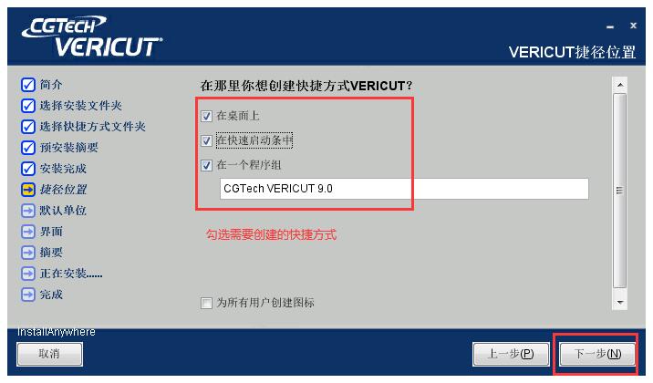17、自行选择是否创建CGTech许可服务的快捷方式,点击安装;