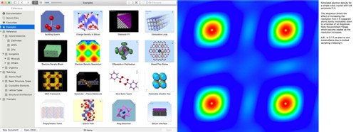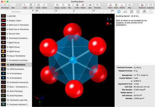 CrystalMaker 文档可以保存多个结构,每个结构都有自己的图形缩略图。虽然一个明显的应用是结构行为和动画,但您还可以保存相同结构、不同模型类型、原子范围或相关结构的不同视图。由于每个结构都可以有自己的注释,因此这是一种理想的教育工具 - 带有可旋转 3D 模型的全交互式幻灯片,在上下文中呈现。程序中包含了如何构建引人入胜的教育内容的示例(例如,“Building Quartz”、“Building Spinel”)。