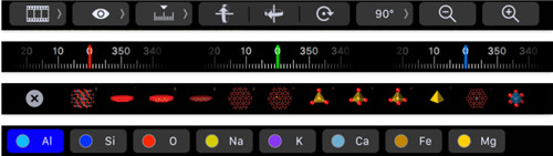 用鼠标单击并拖动,使用键盘或工具栏。视图平行于向量或平面法线。利用触控板的多点触控旋转和缩放,或使用Leap Motion控制器(Windows 版)视频在空间中使用简单的手势。适用于 Mac 的 CrystalMaker - 作为合适的原生 Mac 应用程序 -为新款 MacBook Pro提供专用的触控栏界面:使用专用的触摸拨盘、方向预设和滑块进行旋转和缩放。