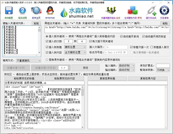 水淼关键词插入助手是一款强大的文本编辑工具,它可以帮助用户快速插入关键词,有效地改善文本的可读性和可理解性。一般作用于网站的运营,尤其是版本更新比较频繁,且内容需要同步更迭的主要关键词变化。