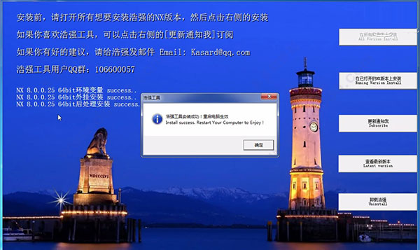 3、双击Kas文件夹下的“浩强工具自动安装程序.exe”,选择“再打开的NX版本上安装”选项,即提示重启生效,如下图所示: