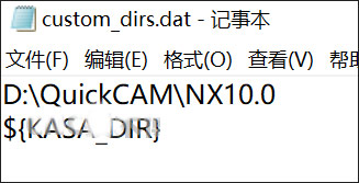 UG安装路径下UG12→UGll→menus→custom_dirs.dat,用记事本打开(先右键修改文件属性只读去掉〉在#下面一行输入${KASA_DIR}