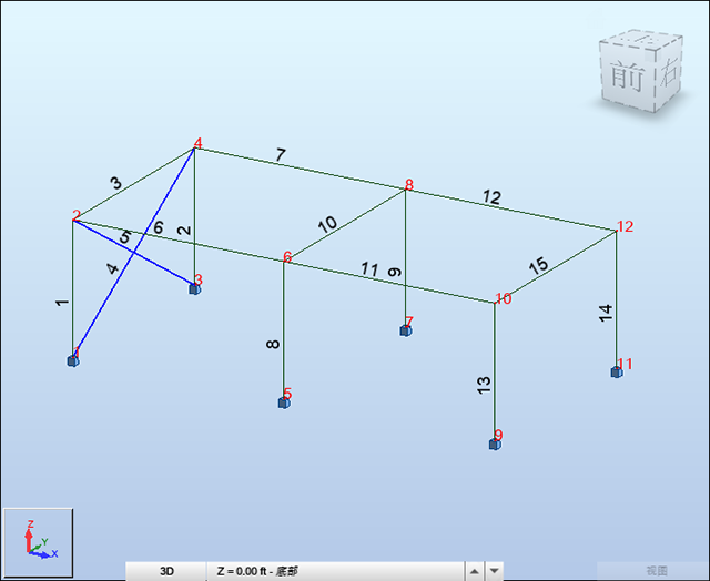 8、在“选择”工具栏的“杆件选择”框 中,输入按空格分隔的柱编号和梁编号,如下所示:“1 2 3”,然后按 Enter 键。选定杆件和节点将在屏幕上亮显,如下所示。