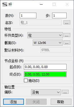 4、要创建第一个柱,请在“起点”和“终点”框中输入“节点”坐标,如下所示: