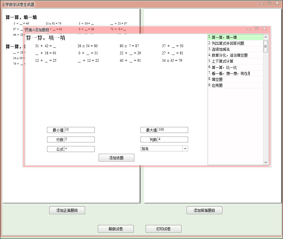 除此之外,小学数学试卷生成器还为用户们提供了算一算填一填、列算式回答问题、连续连续加减法、比大小、应用题等多种题型供用户自由添加,而且只要有了这款学数学试卷生成器,用户只需要选择题目类型,并设置最小值、最大值、行数、列数、公式、算法等参数即可快速的生成题目再添加到试卷中,非常的轻松方便,这样就能快速的为用户生成出各种你想要的小学数学试卷啦。