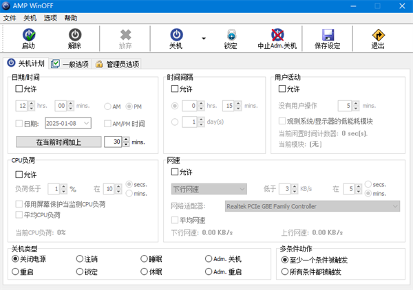这款amp winoff汉化版软件确实挺厉害的,功能超多又实用,而且操作界面也很简洁,体积小不占内存。最让我觉得牛的是它不仅能定时关机,还能根据CPU负载、网速甚至间隔时间来触发各种任务,比如关机、重启或者睡眠,这种智能化的设计真的很方便。