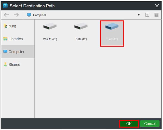 3、然后在弹出窗口中,您会看到计算机上的所有分区都显示在此处。建议选择一个外部硬盘驱动器的一个分区作为位置。