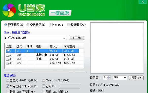 U当家一键备份还原系统:不用安装即可使用,绿色安全,兼容性强,功能完善。可在Win32(64)、WinPE、DOS 下对任意分区进行一键备份与还原,支持ISO文件、光盘、U盘里的GHO文件硬盘安装;支持设定密码保护、自定义热键等功能。