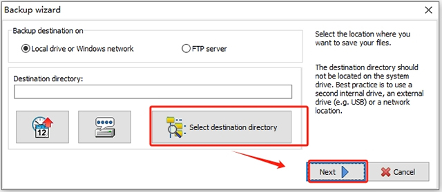 2、这里是备份的地址选择界面,Local drive or Windows network是保存在本地,FTP server是保存在FTP服务器。