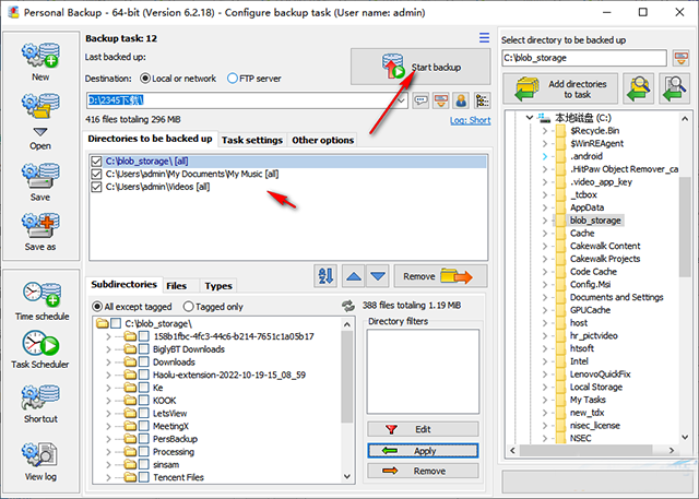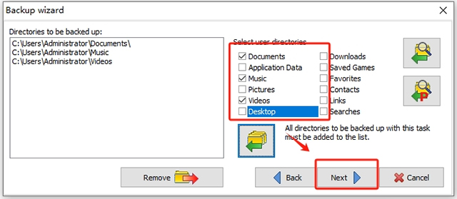 3、选择需要备份的目录,直接在右侧选择对应的数据添加到左侧,可以手动添加文件夹。